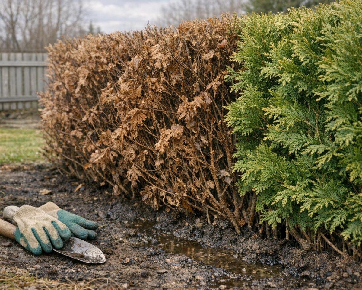 Hovedårsaken til tørkestress er ujevn vanning. Selv om det regner en dag, kan jorda rundt rotballen tørke ut raskt – spesielt hvis jorda er sandholdig. Vind forverrer situasjonen ved å øke fordampningen fra blader og nåler, noe som gjør hekker på utsatte steder ekstra sårbare.