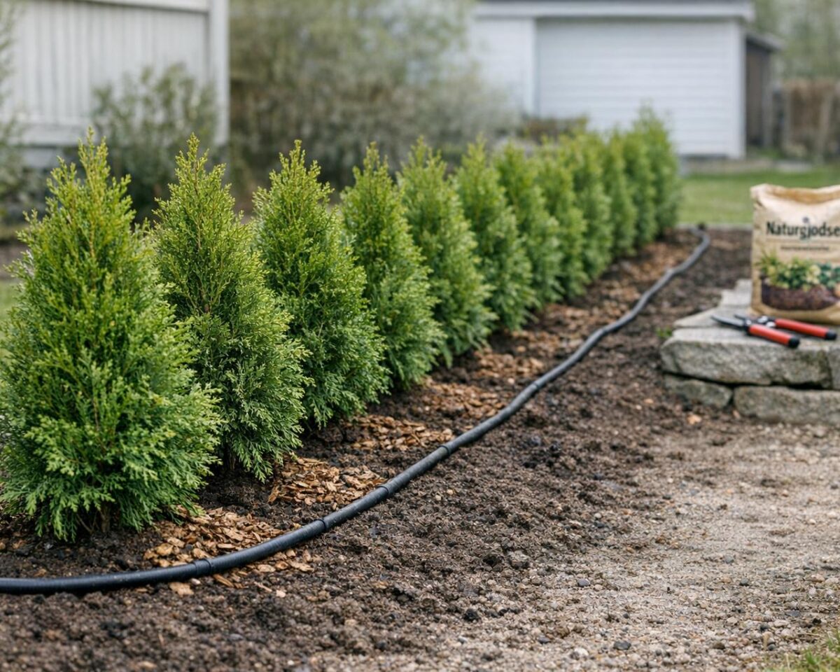 Etter noen sesonger, når hekken har utviklet dype røtter, vil den klare seg med mindre vanning og kun trenge ekstra vann i perioder med langvarig tørke. God vanning i etableringsfasen gjør at du slipper hyppig manuell vanning senere. For å gjøre jobben enklere kan du vurdere dryppslanger eller automatiske vanningssystemer, som gir jevn fuktighet uten daglig oppfølging. Et lag med kompost eller bark rundt plantene kan også bidra til å holde på fuktigheten i jorden og redusere konkurranse fra ugress. Dette gir hekken de beste forutsetningene for å trives på lang sikt.