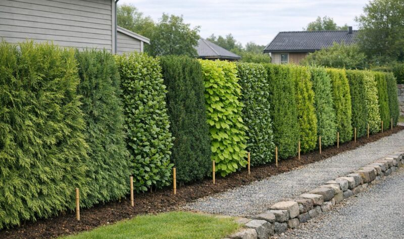 Praktisk guide til fem robuste hekkplanter for norske hager – vekst, stell, klimaegenskaper og hvilke som gir best skjerming og vindbeskyttelse.